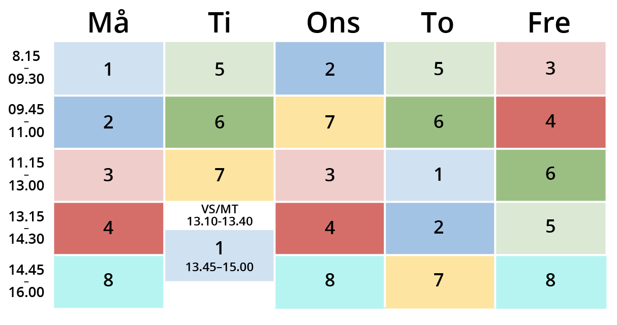Vårt positionssystem är grunden för hur schemat byggs upp. Varje period har sju/åtta positioner vars lektioner (med undantag för brytveckorna) infaller så här: